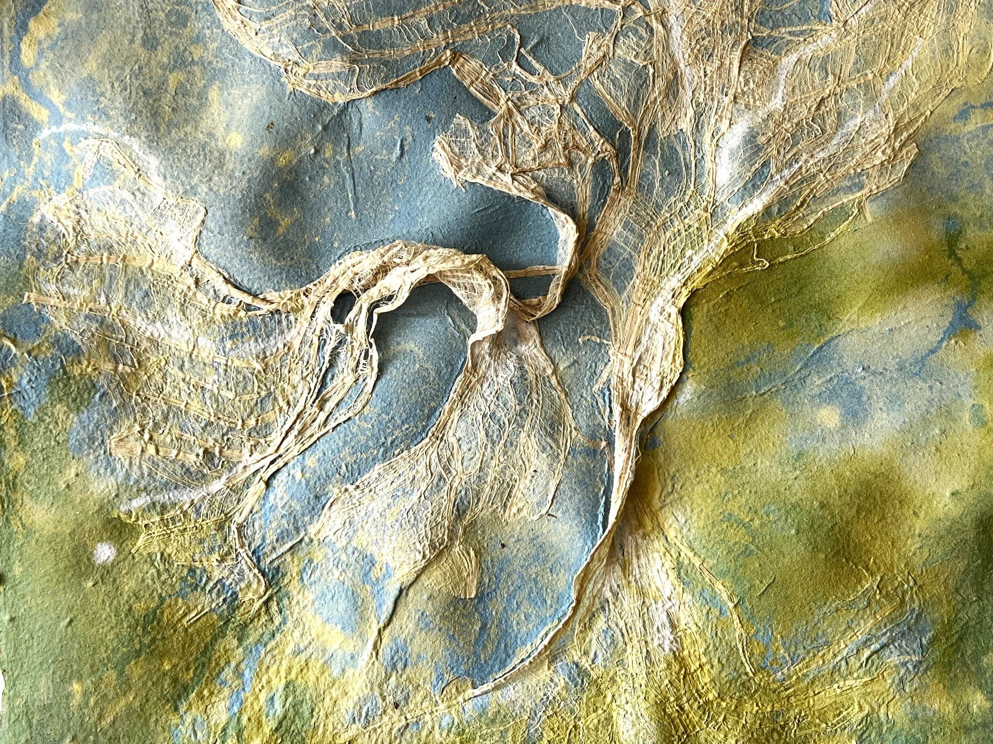 During the pandemic, locked in isolation with supply chains broken, the found material I was used to working with, disappeared. But people working from home were producing mountains of office waste. So, I watched video demos till I had learned not only how to turn it into pulp, but also cast and dye the pulp into paper-based paintings, and shapes. Collecting Hosta leaves to cast on, became something of an obsession. Earlier in 2022, when artists finally began to give in person workshops, I learned the mechanics of papermaking from a wonderful teaching artist Jo Stealey.
