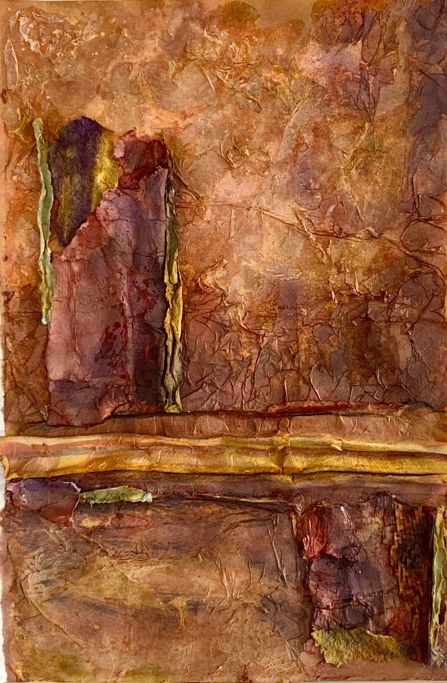 Having moved to many cities, over continents and oceans, my heart wants a constant home. Nature has provided that. No matter where one is, there is inspiration provided by the colors in a sunset, or the rough textures of tree bark or rock forms, or the shine of dewdrops on a flower. So, when the mood to create grabs me, I am never at a loss for where to start. Pouring color into paper pulp or sheets of found paper, shaping, and twisting as I go, the painting takes on a life of its own. I just go with the flow! That’s when I find my moment of Zen.